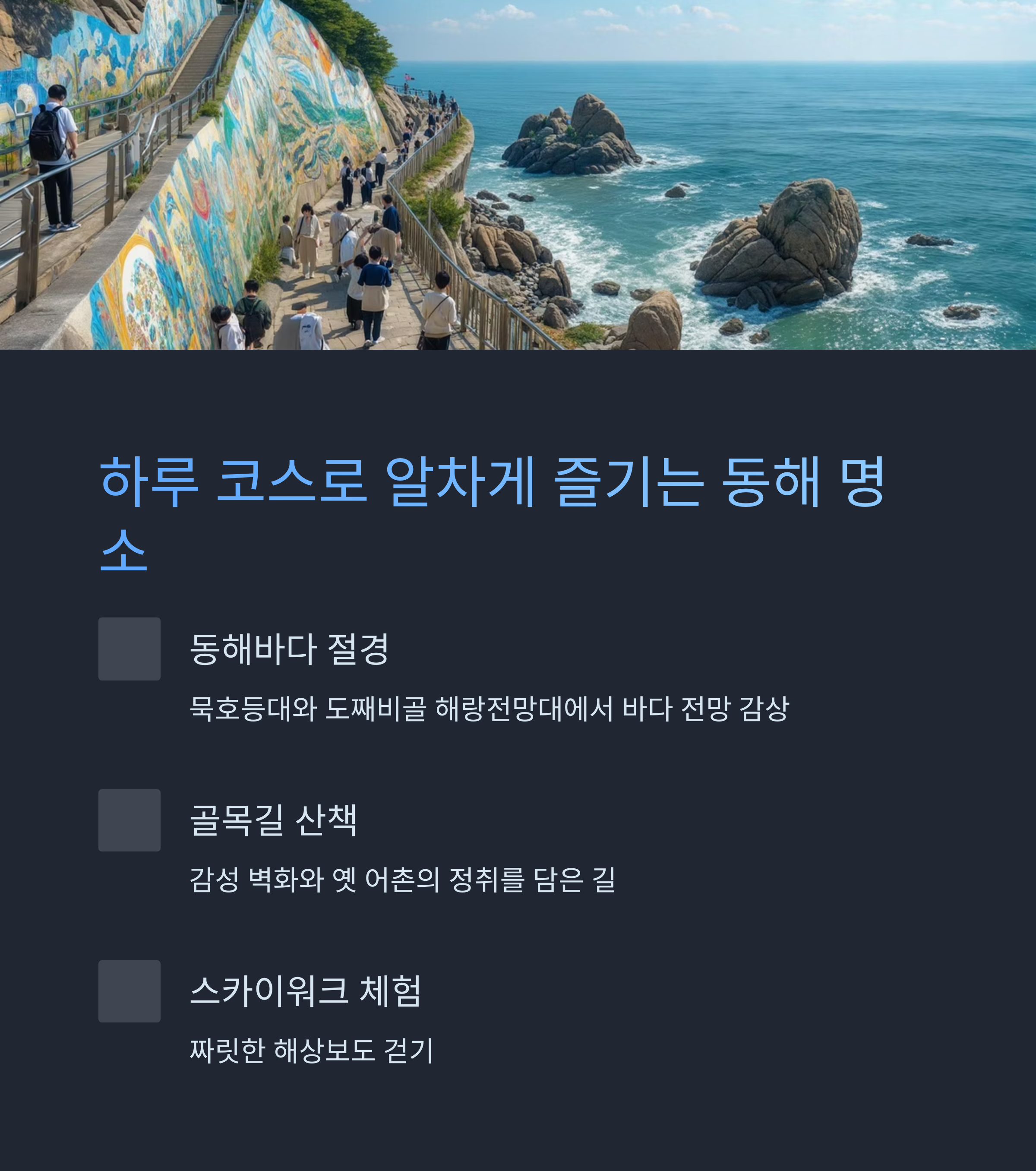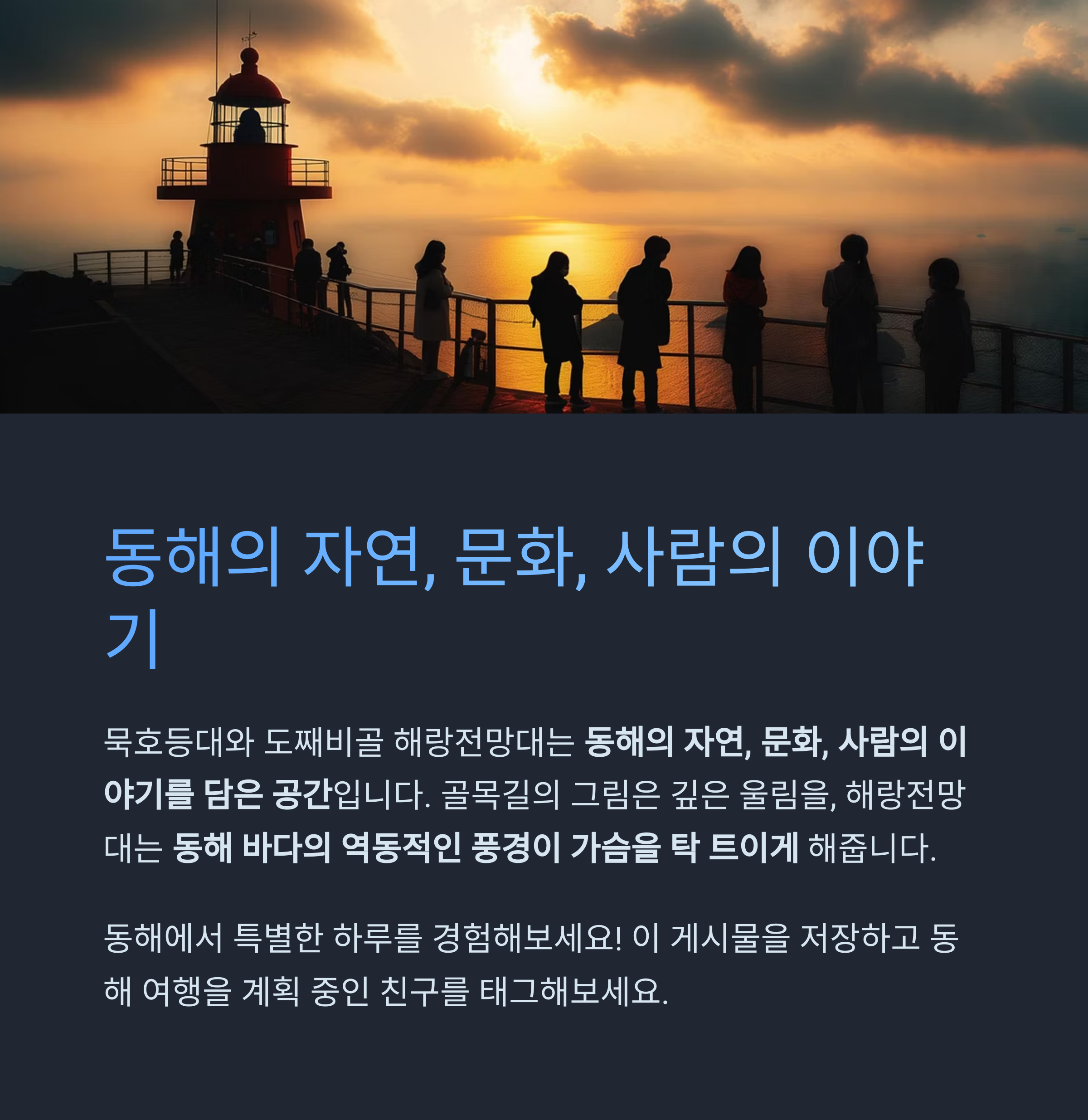 단순한 관광지를 넘어서 동해의 자연, 문화, 사람의 이야기를 담은 공간입니다.