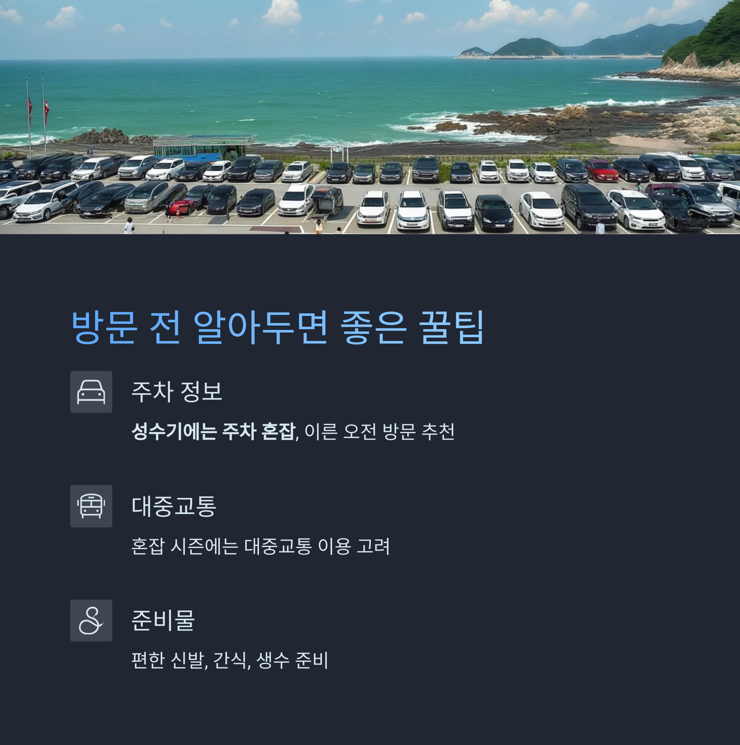 이른 오전 방문이나 대중교통 활용도 고려하는 것이 좋습니다.