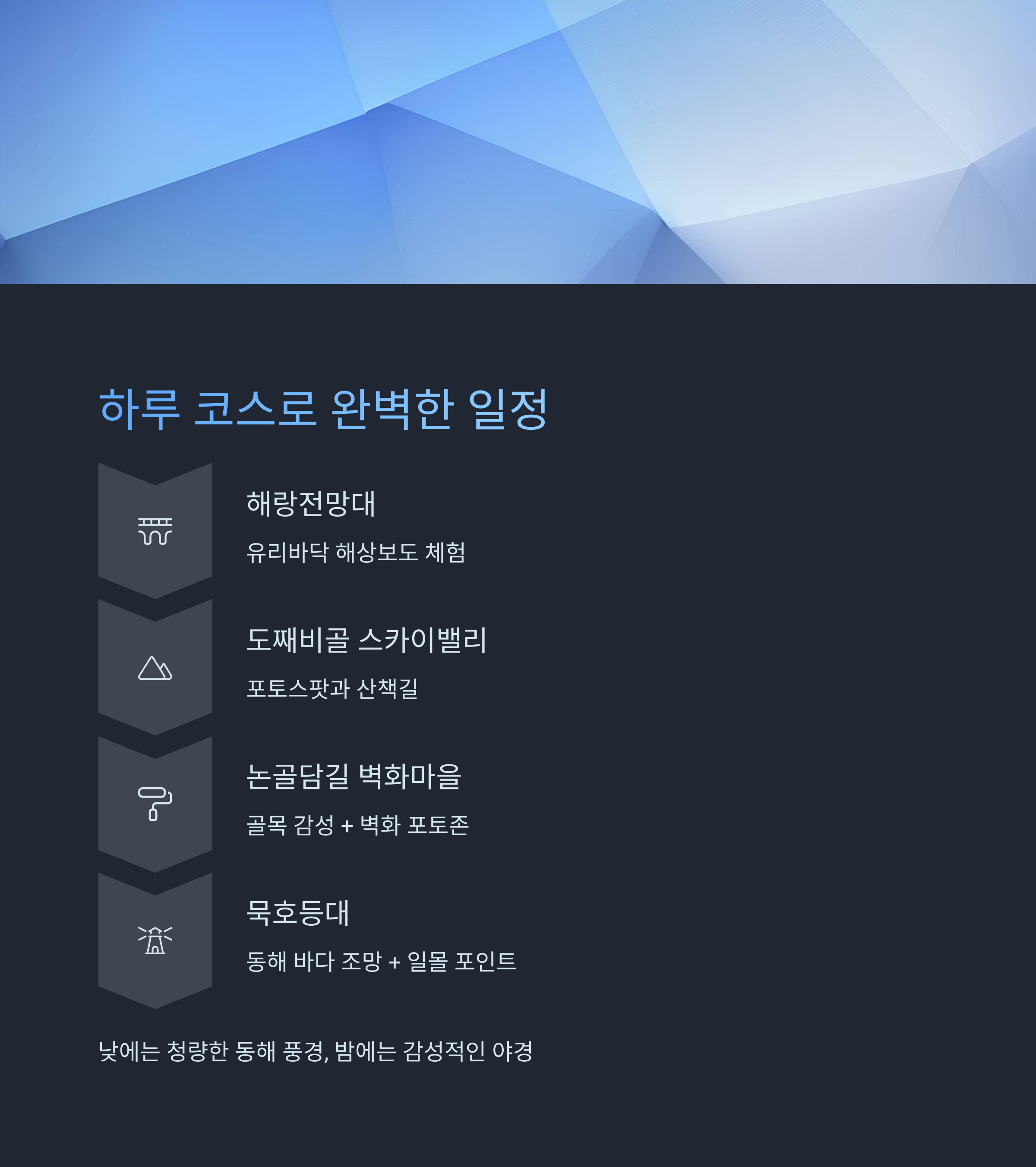 이 코스는 낮에는 청량한 동해 풍경, 밤에는 감성적인 야경을 모두 담을 수 있어