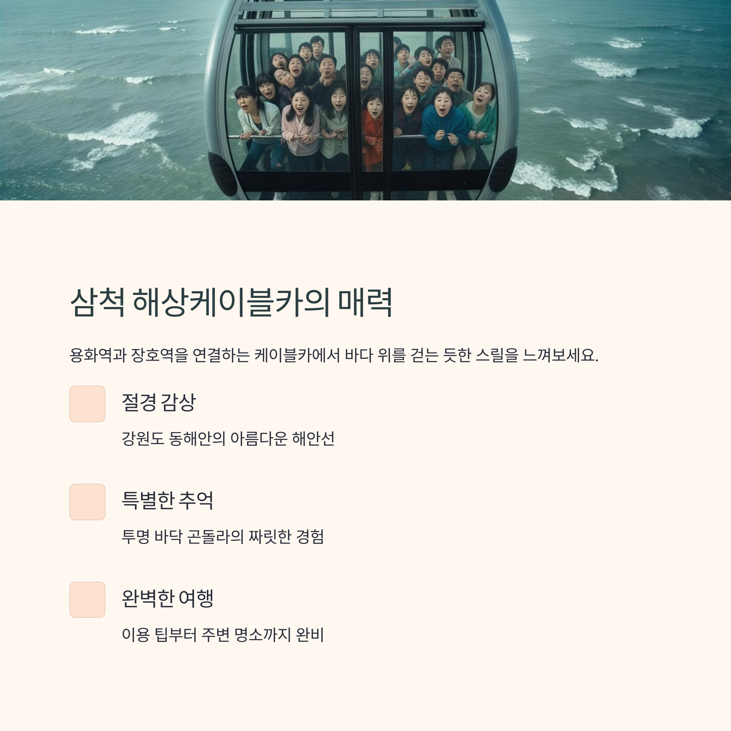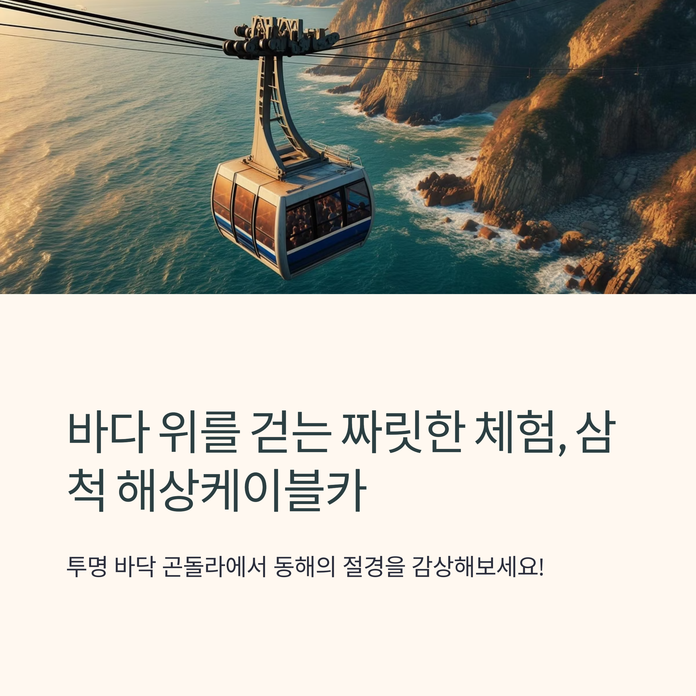 삼척 해상케이블카는 강원도 동해안을 따라 펼쳐지는 삼척의 해안 절경을 가장 생생하게 즐길 수 있는 명소입니다.