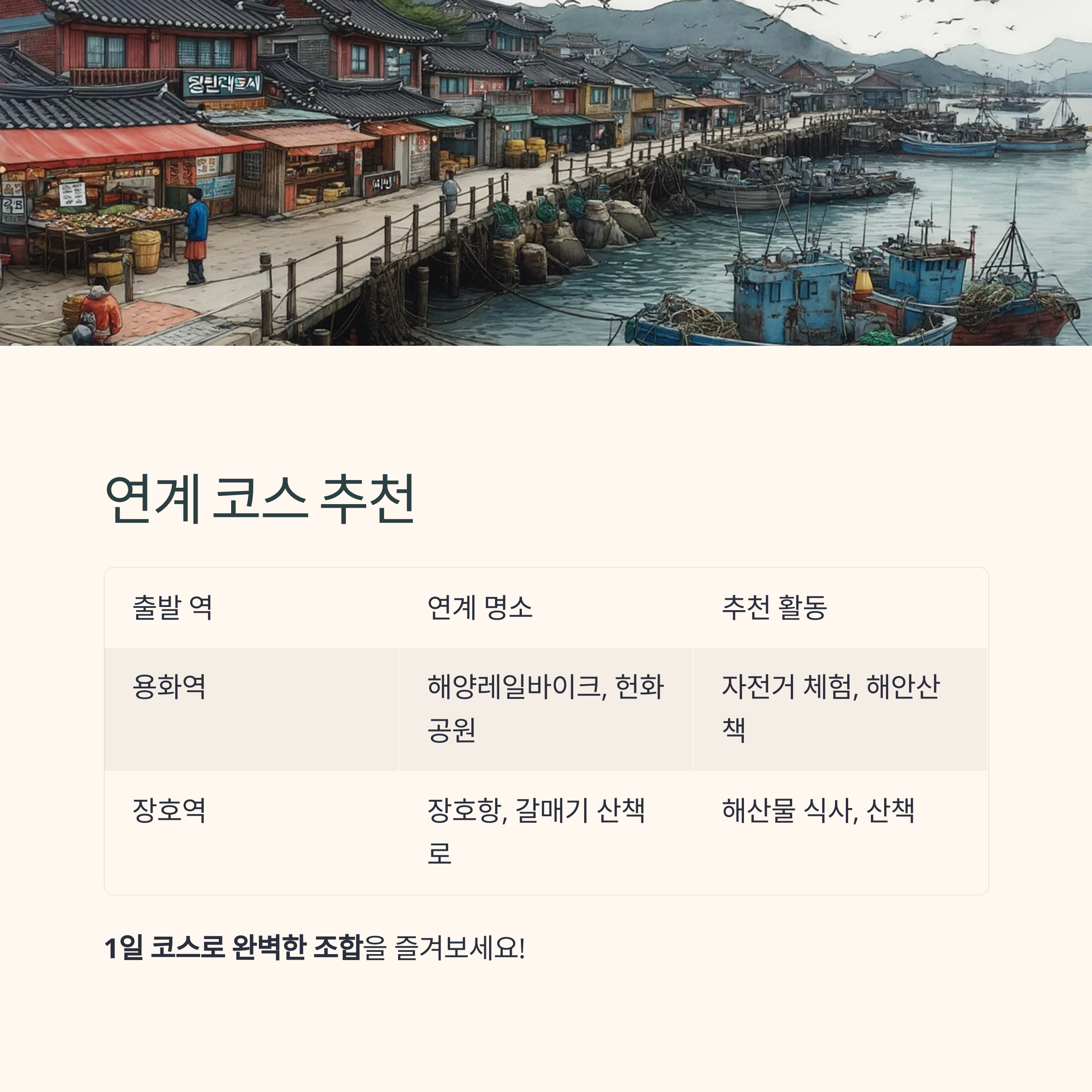 | 장호역 | 장호항, 갈매기 산책로 | 해산물 식사, 산책 |