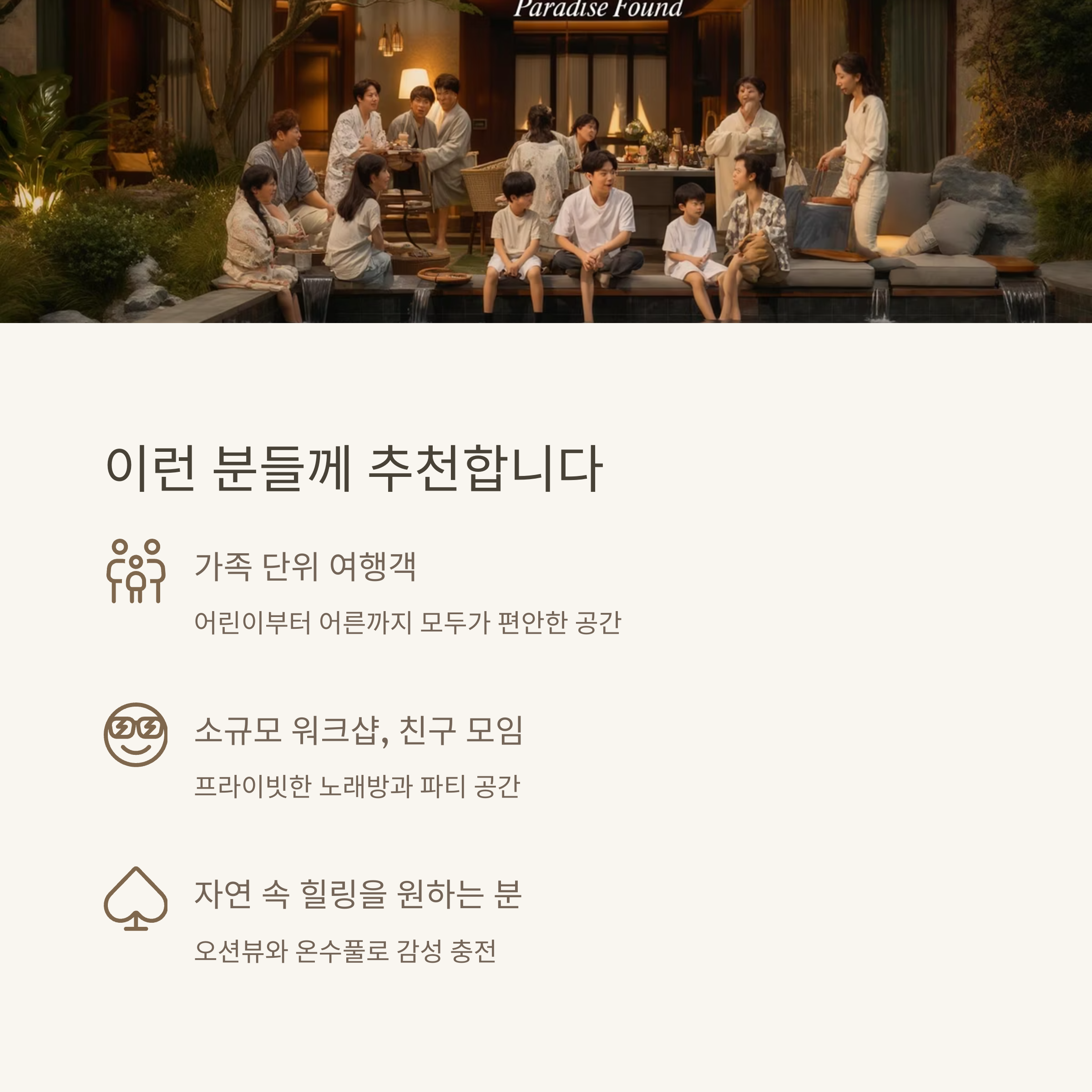 대가족과 단체 여행객에게 최적화된 공간 구성과 고급 편의시설을 자랑합니다.