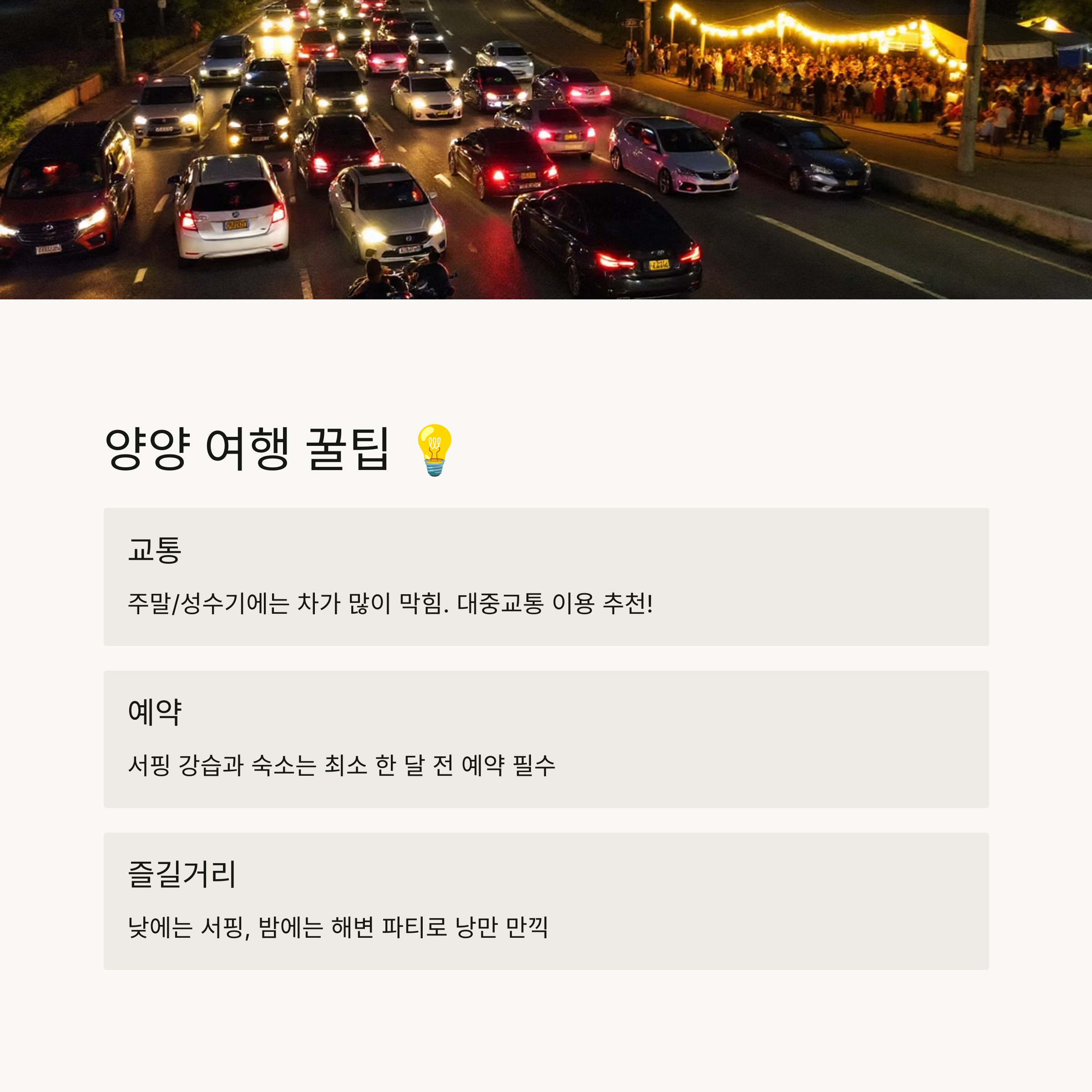 양양은 주말이나 성수기에는 차가 정말 많이 막혀요. 가급적 대중교통을 이용하거나, 시간 여유를 넉넉하게 잡고 출발하시는 걸 추천해요. 서핑 강습과 숙소는 최소 한 달 전에는 예약해야 원하는 곳을 잡을 수 있답니다!
