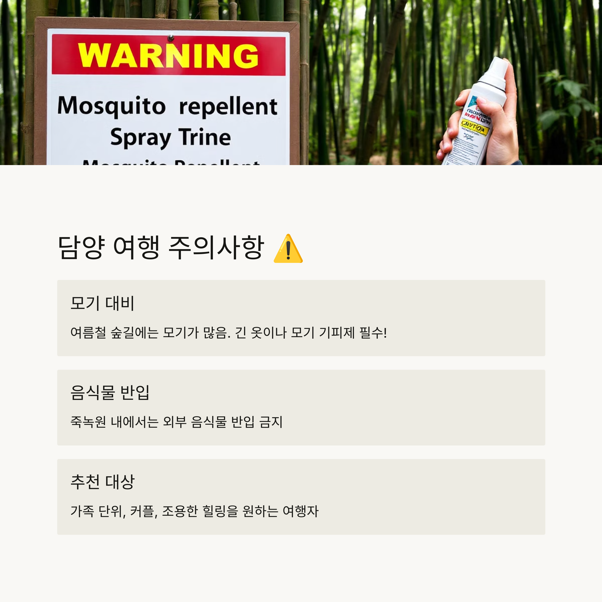 여름철 숲길에는 모기가 많을 수 있어요. 방문 시에는 긴 옷을 입거나 모기 기피제를 꼭 챙겨가세요. 또한, 죽녹원 내에서는 외부 음식물 반입이 금지되어 있으니 참고하세요!