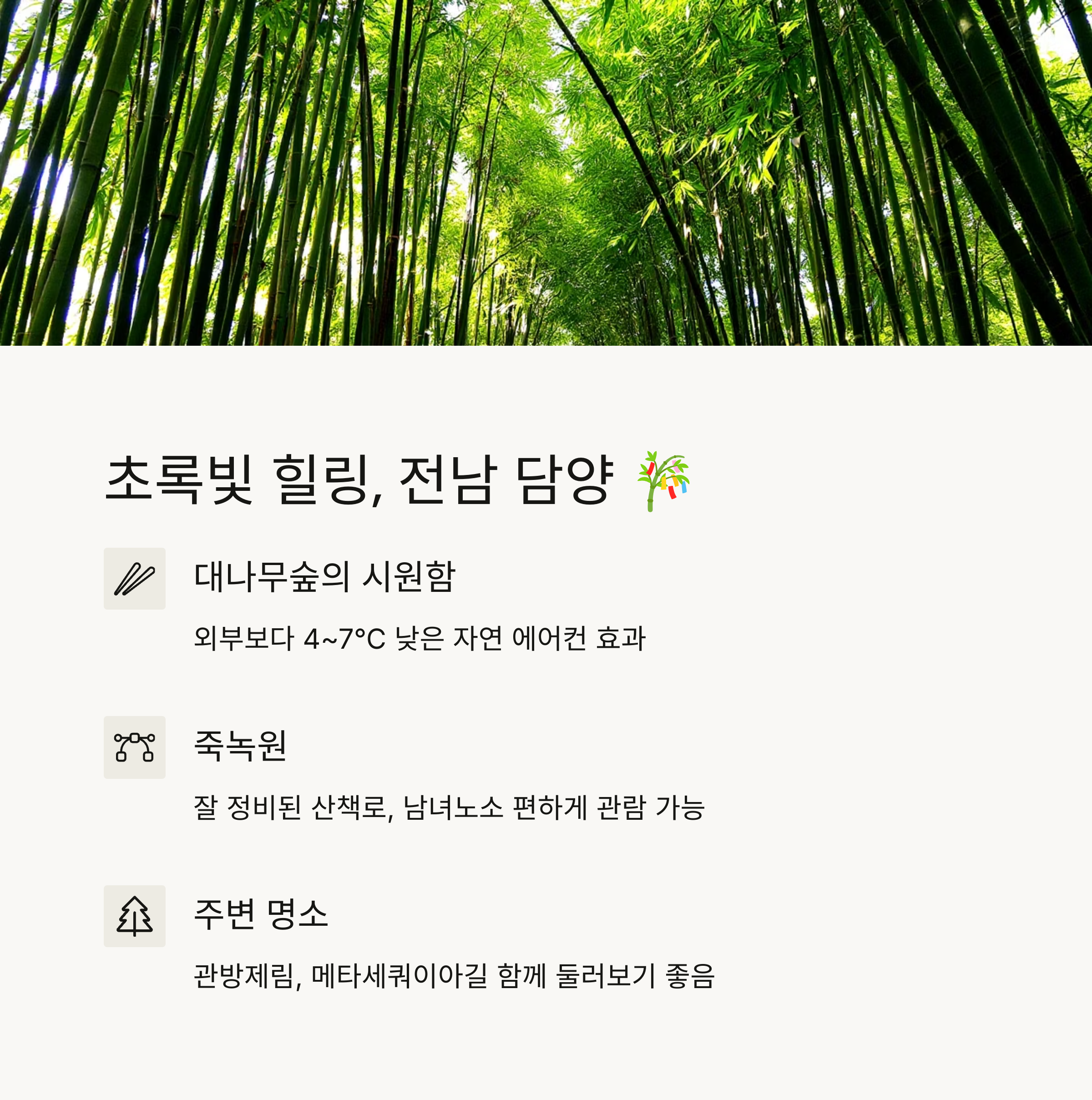| 전남 담양 | 대나무숲, 자연 속 힐링, 여유 | 가족 단위, 커플, 정적인 여행 선호자 |