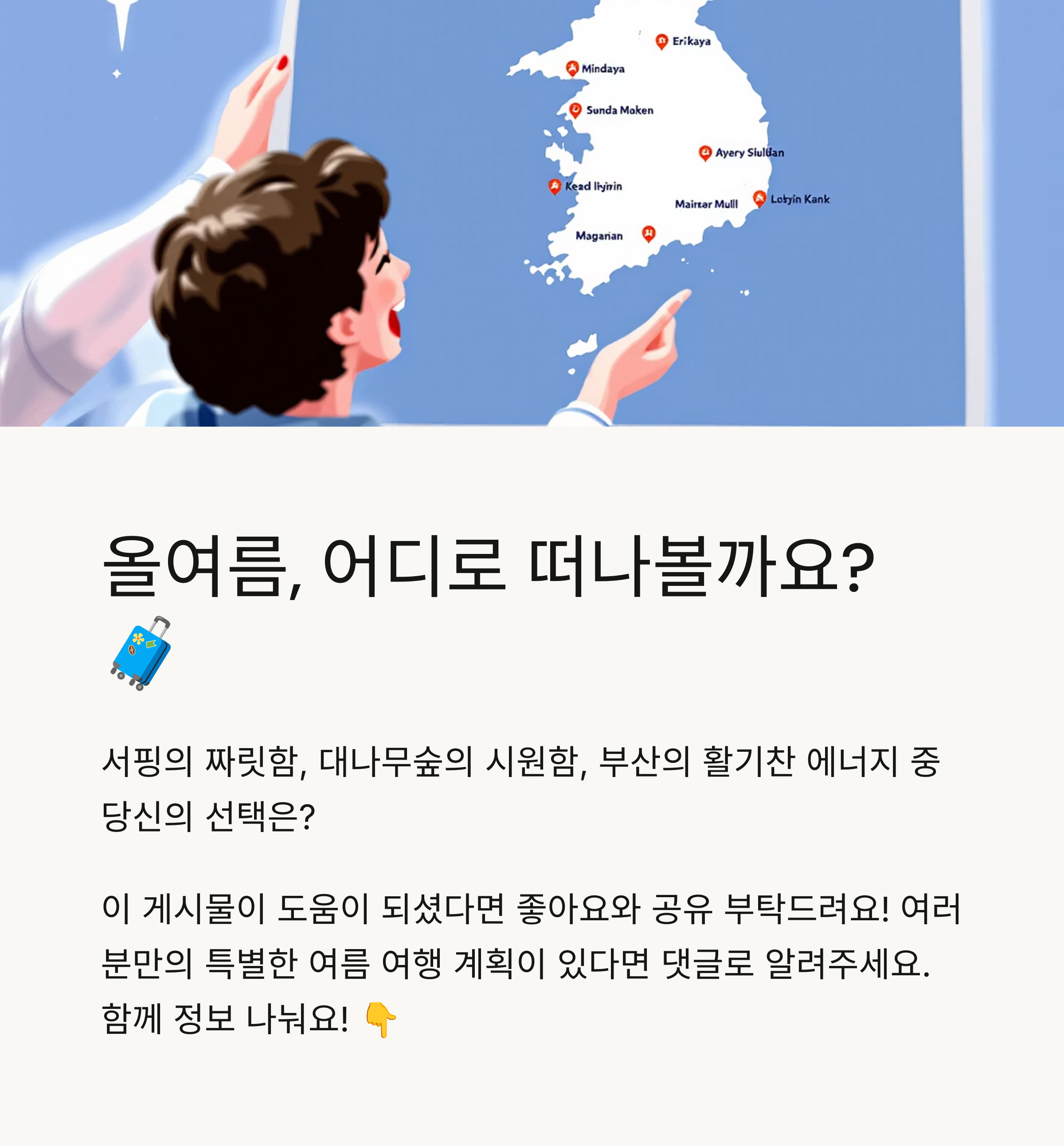 오늘은 7월과 8월, 뜨거운 여름을 시원하게 날려줄 국내 여행지 세 곳을 소개해 드렸는데, 어떠셨나요? 여러분은 어떤 스타일의 여행을 더 선호하시나요? 각자 취향에 맞는 곳에서 잊지 못할 여름휴가를 보내시길 바랄게요! 여러분만의 또 다른 여름휴가 명소가 있다면 댓글로 공유해 주세요~ 😊