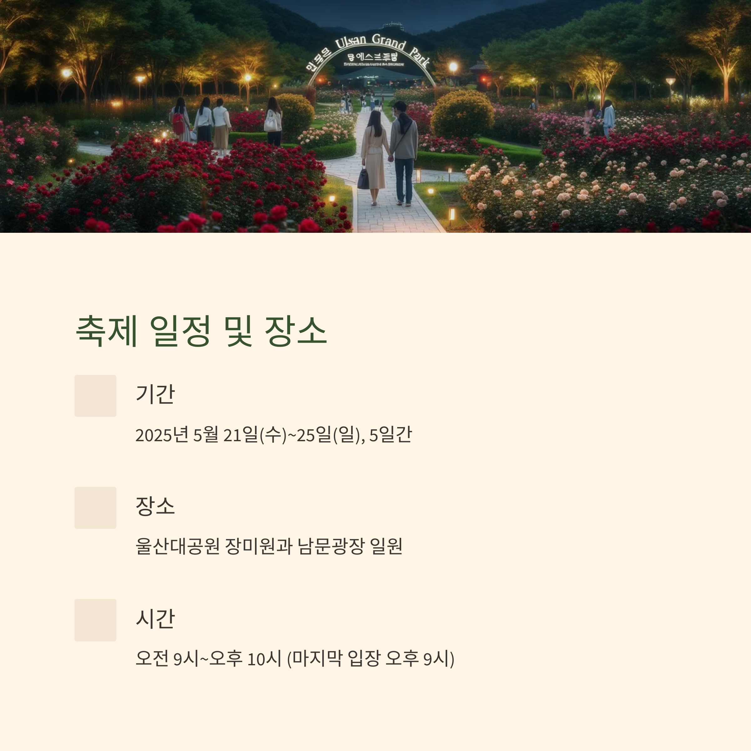 2025년 울산대공원 장미축제는 5월 21일(수)부터 25일(일)까지 5일간 진행됩니다.