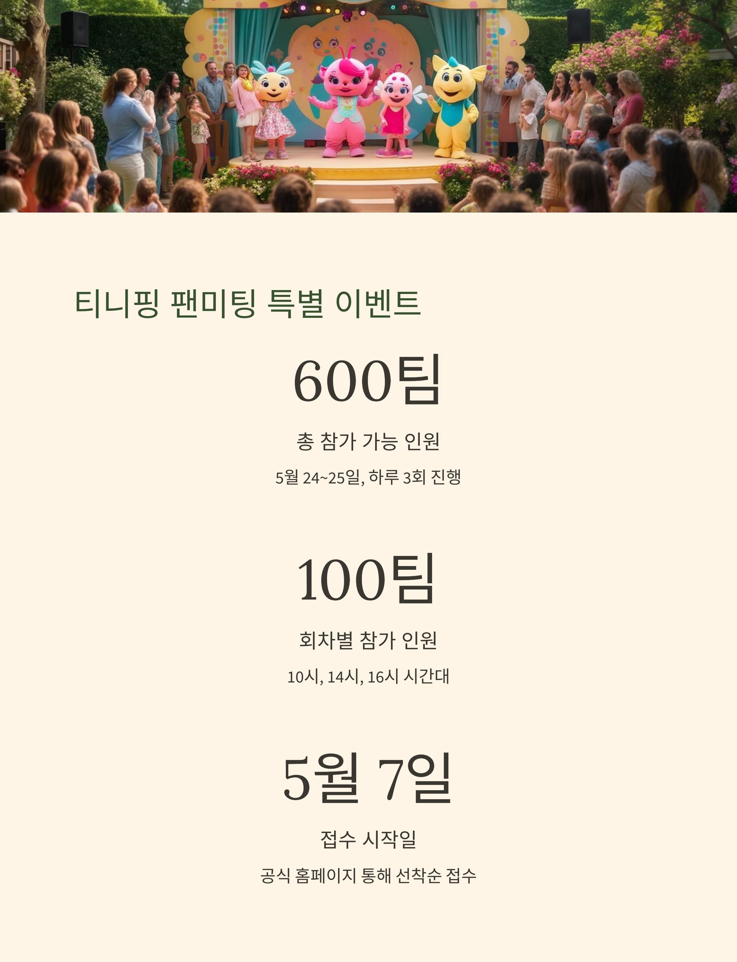 이번 축제의 특별 이벤트는 인기 캐릭터 ‘티니핑’ 팬미팅입니다.