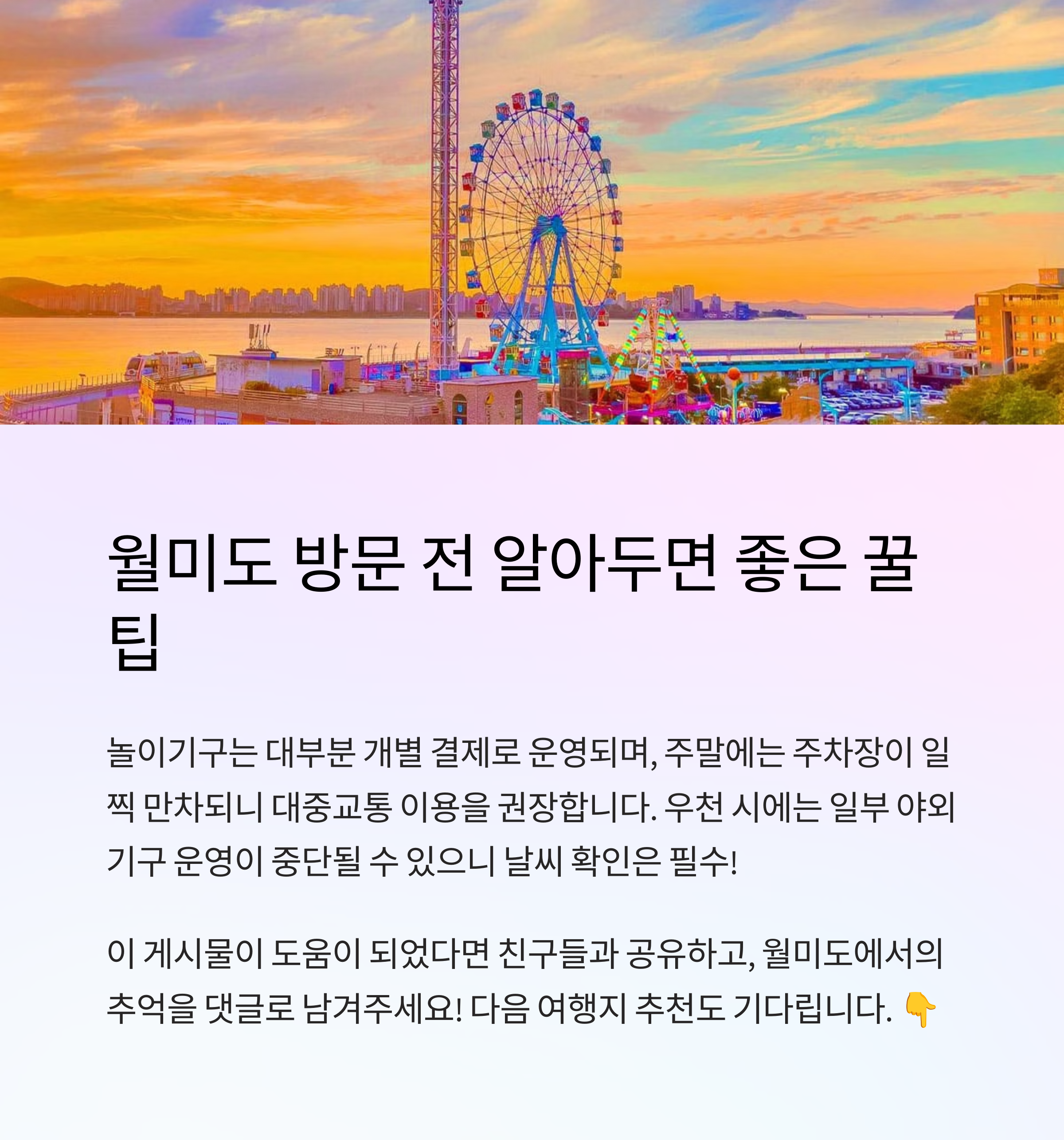 2025년 현재, 인천의 대표 놀거리 명소 월미도 테마파크는 입장료 없이 자유롭게 입장할 수 있으며, 놀이기구와 먹거리, 산책 코스까지 다채로운 즐길 거리를 제공합니다. 디스코팡팡부터 대관람차 ‘문아이’까지 30여 종의 놀이기구는 연인, 가족, 친구 누구와 와도 만족할 만한 구성을 자랑합니다. 본 글에서는 월미도 테마파크의 주요 놀이기구, 야경 명소, 주변 코스까지 하루를 꽉 채울 수 있는 알짜 정보를 정리해 드립니다.
