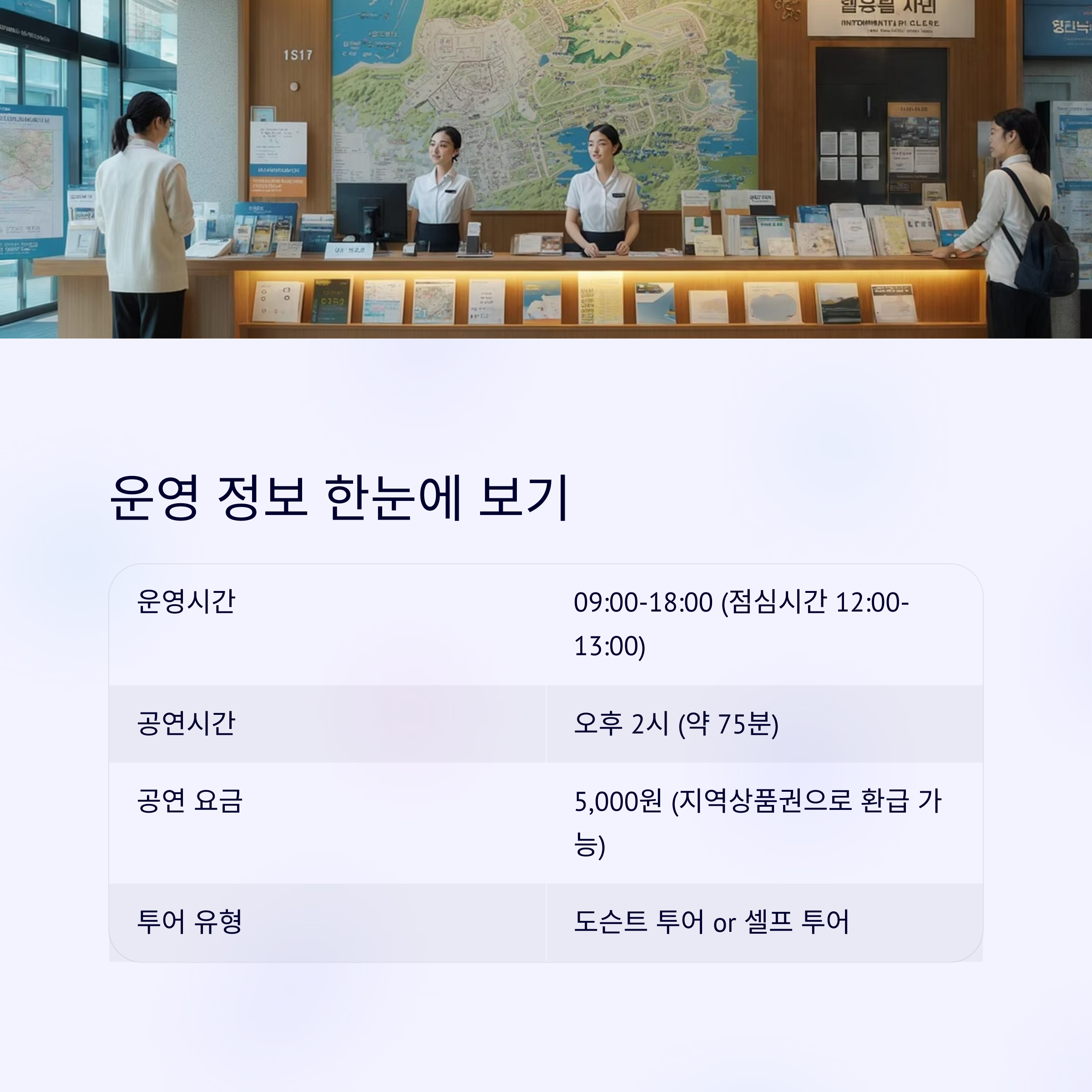 아래 표는 관람 전 알아두면 좋은 운영 정보를 정리한 것입니다.
