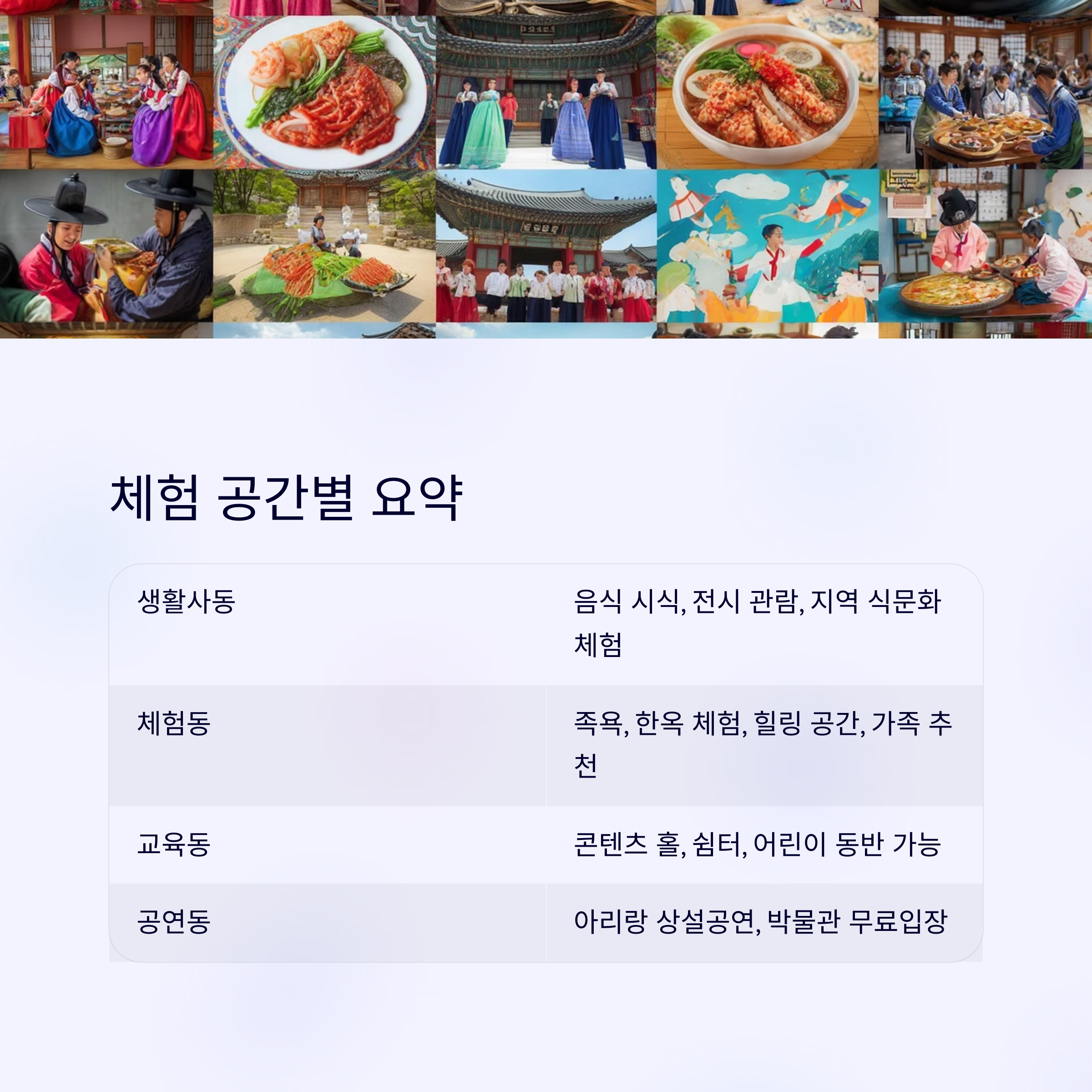 | 생활사동 | 음식 시식, 전시 관람 | 지역 식문화 체험 중심 |