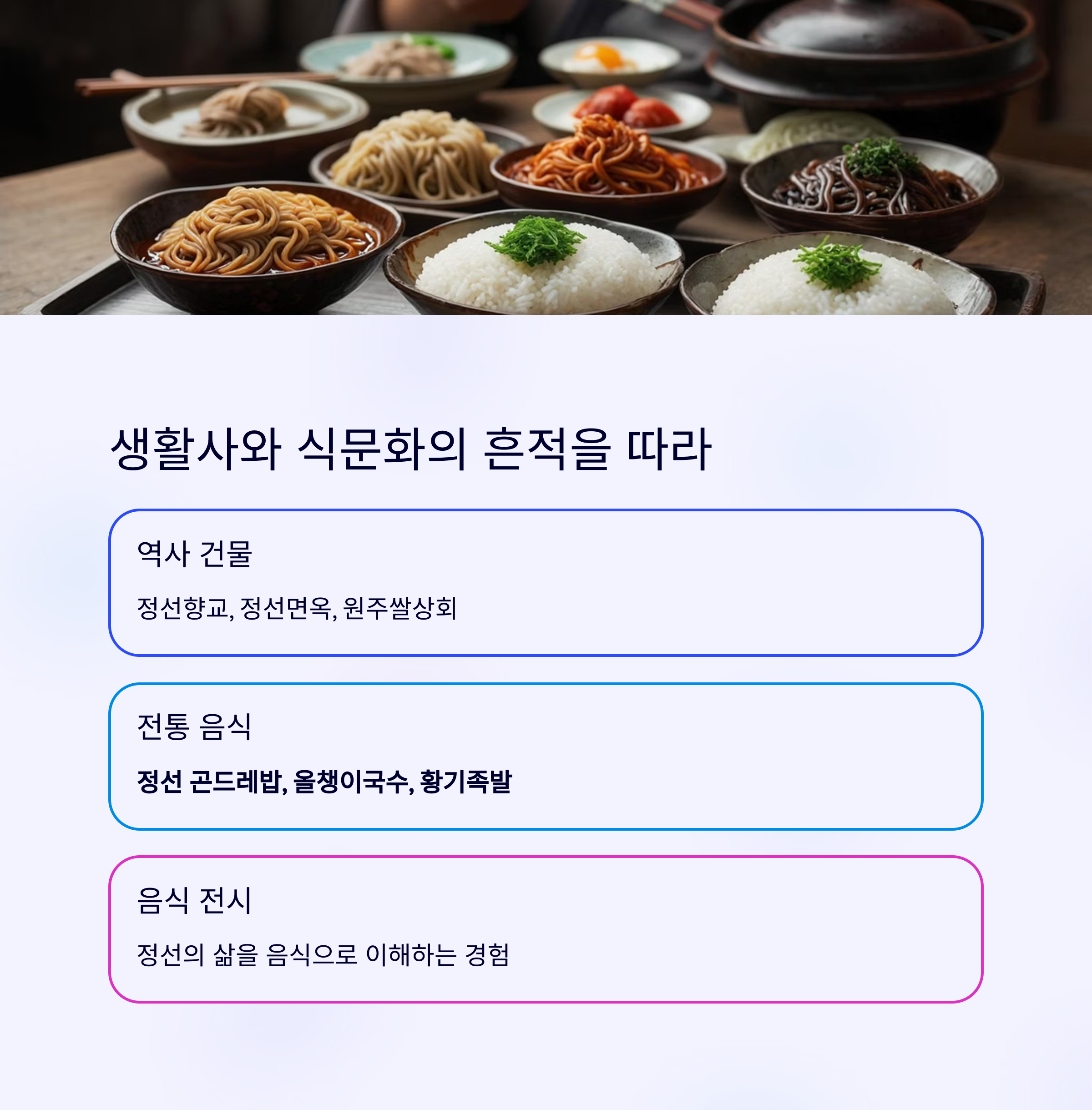 정선 곤드레밥, 올챙이국수, 황기족발을 시식하며 과거와 현재의 식문화를 자연스럽게 연결해줍니다.