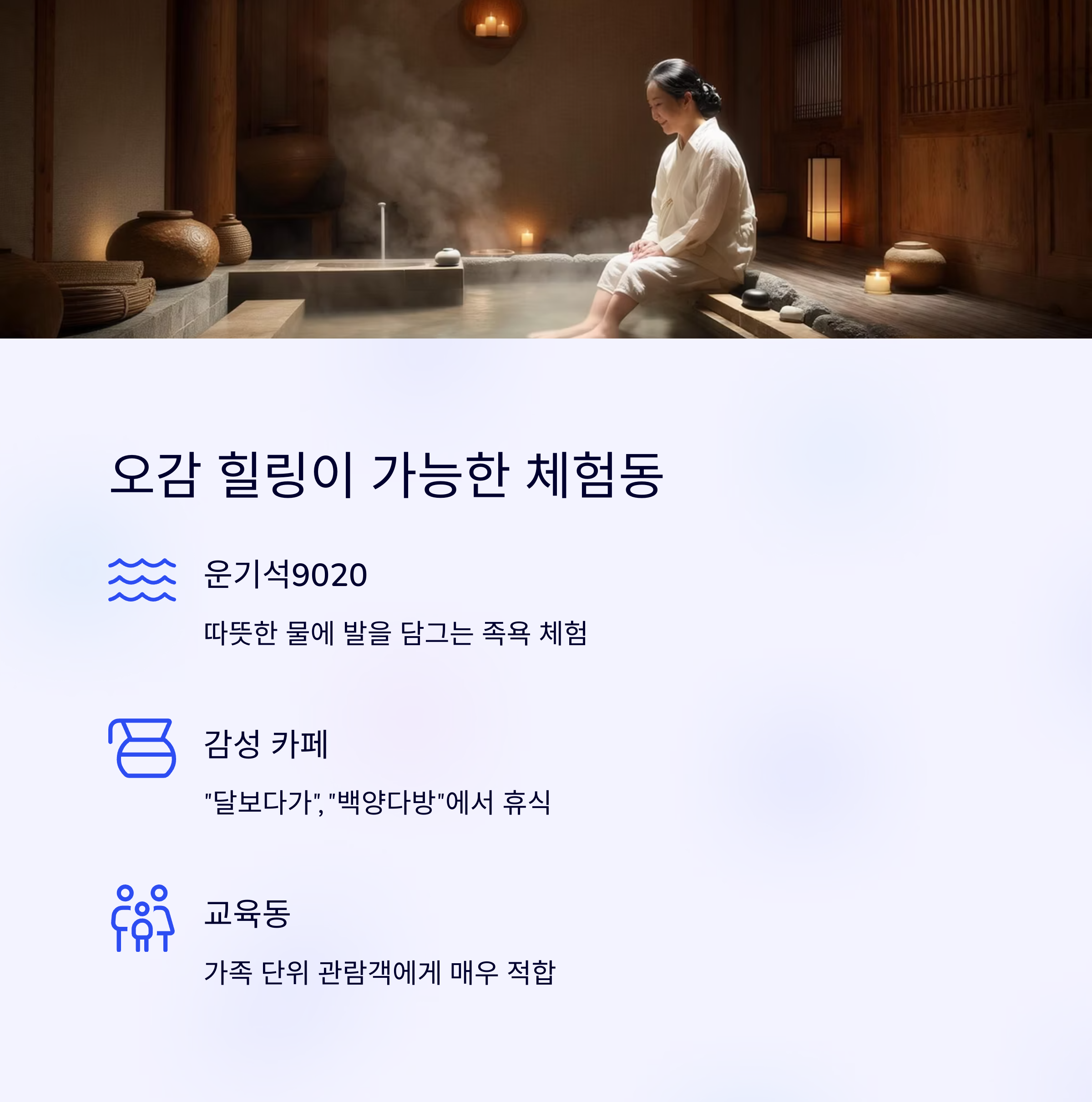 | 체험동 | 족욕, 한옥 체험 | 힐링 공간, 가족 추천 |