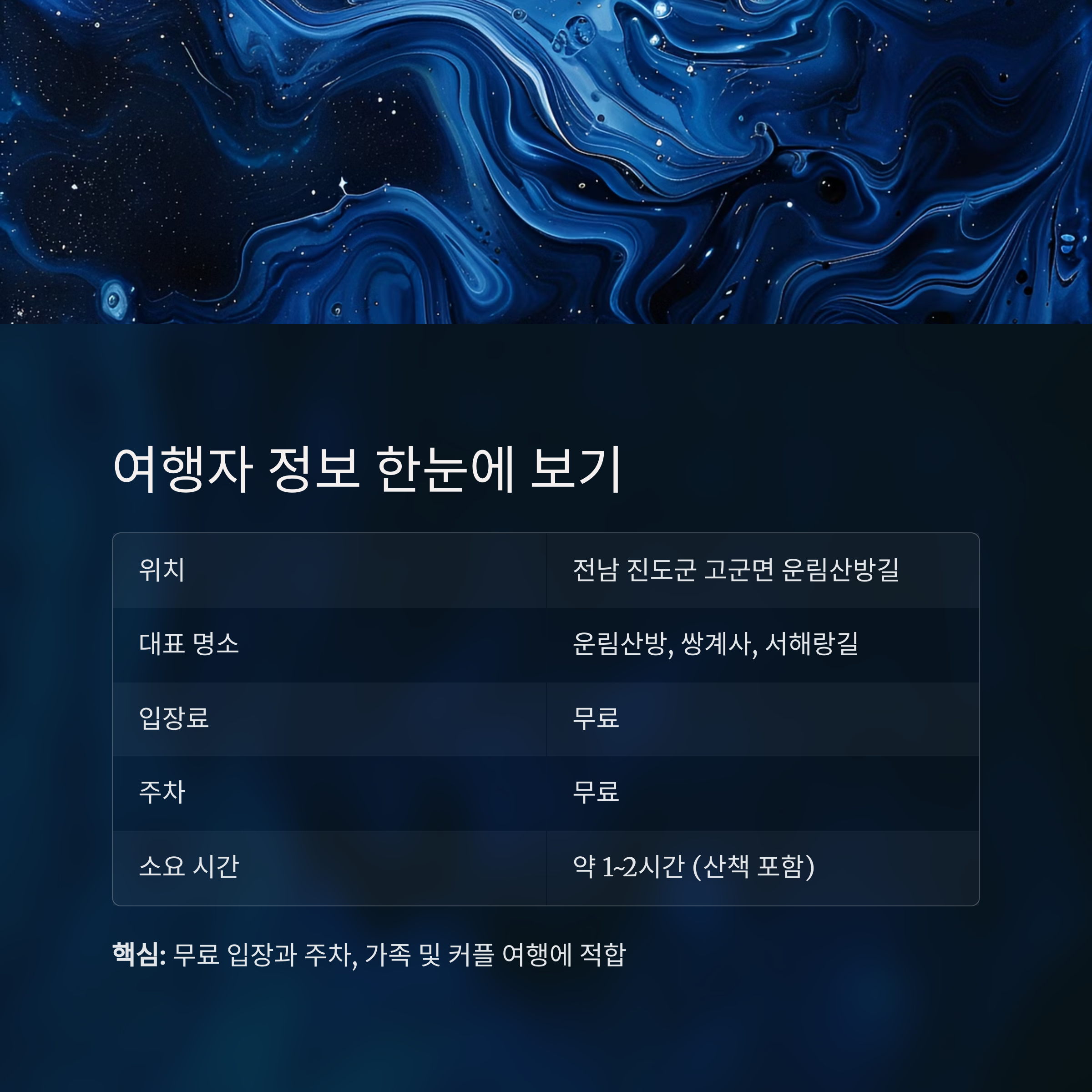 무료 주차와 촬영 명소까지 갖춘 진도 힐링 명소로 가족과 연인 모두에게 안성맞춤입니다.
