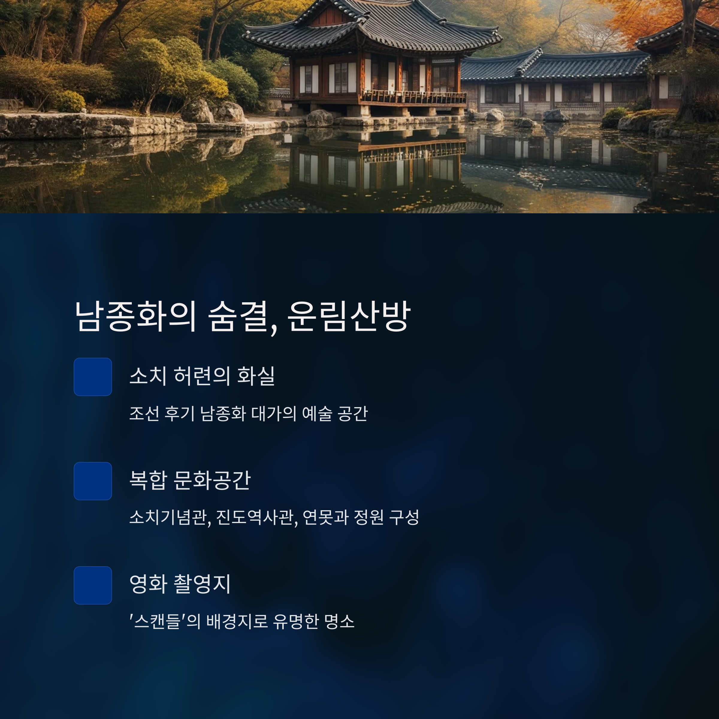자연 풍광 속에서 전통 회화의 멋을 느낄 수 있는 명소입니다.