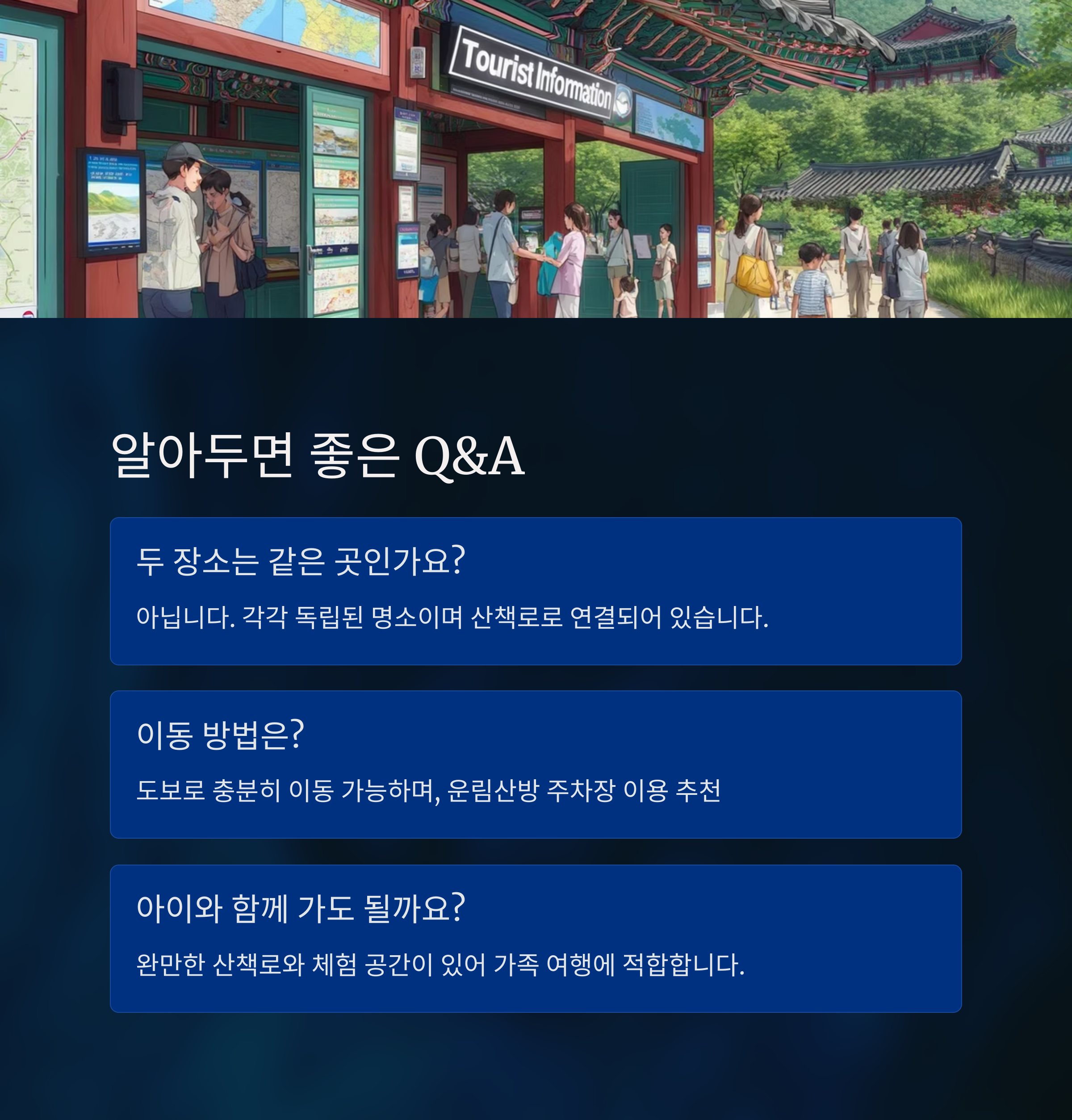 핵심 정보: 두 장소 모두 무료입장과 무료 주차 가능,