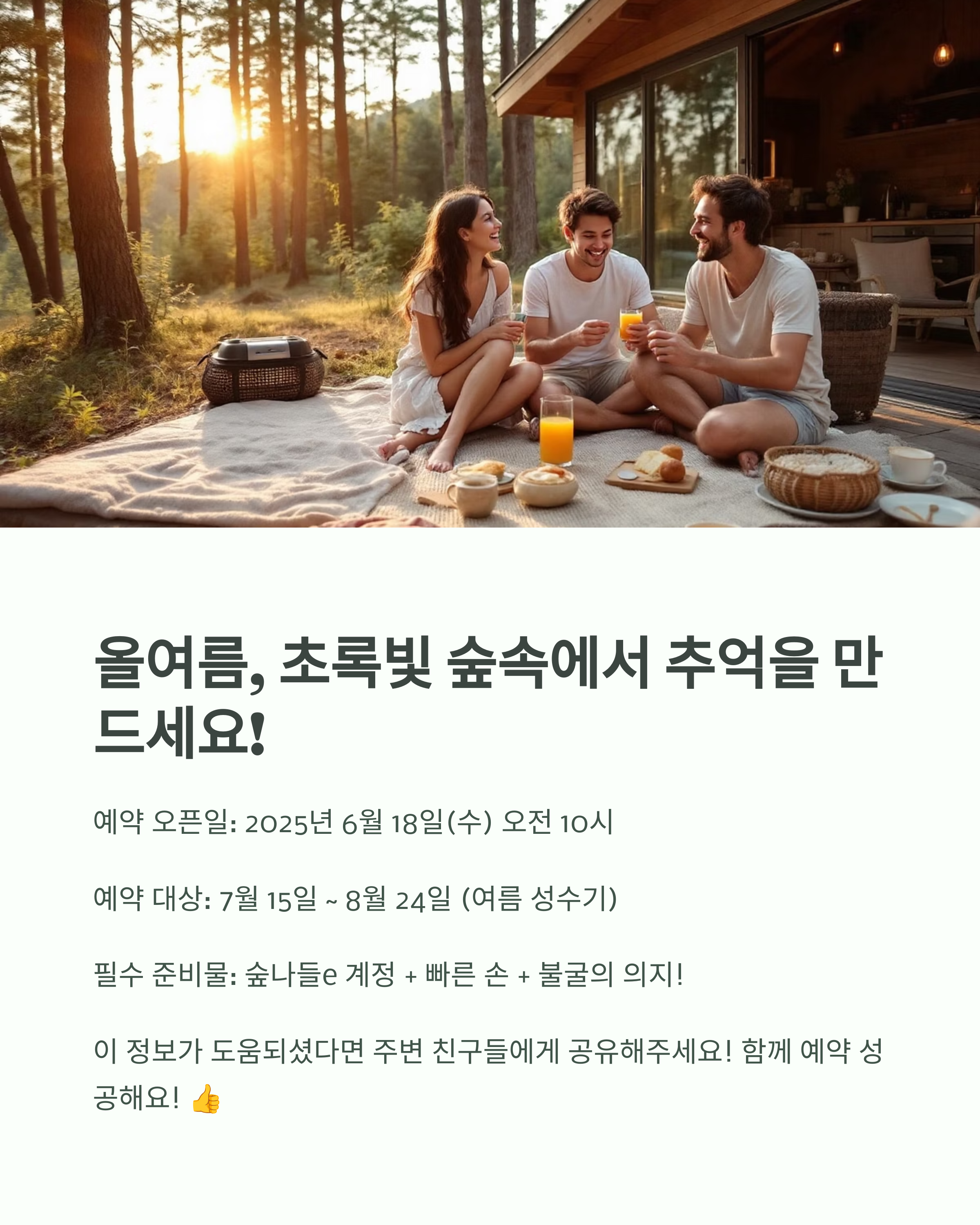 올여름, 초록빛 숲 속에서 잊지 못할 추억을 만들고 싶다면 이번 국립자연휴양림 예약을 절대 놓치지 마세요! 이 글을 보신 모든 분들의 예약 성공을 진심으로 기원합니다. 혹시 더 궁금한 점이 있다면 언제든지 댓글로 물어봐주세요~ 😊