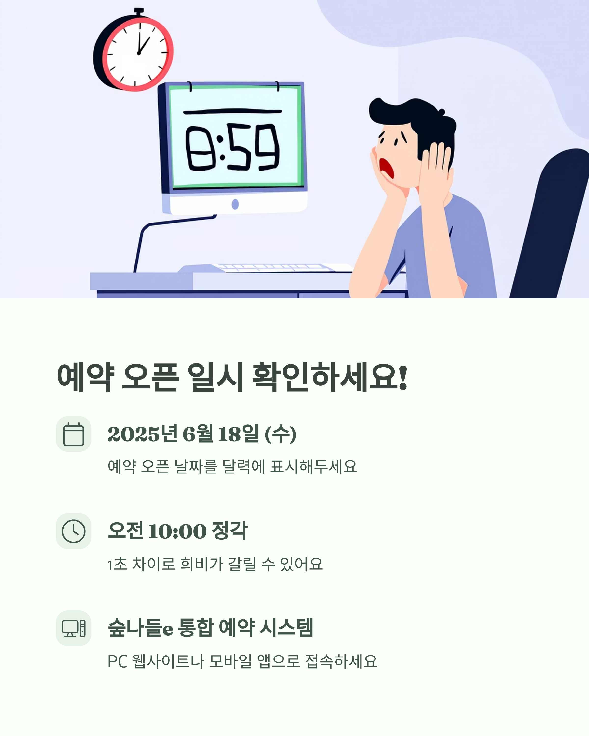 | D-3 (전략 수립) | 가고 싶은 휴양림 3~5곳의 리스트를 만들고, 1~3순위 우선순위를 정해두세요. 플랜 B, 플랜 C는 필수입니다. |